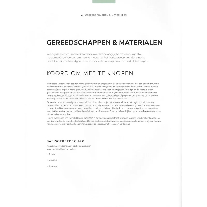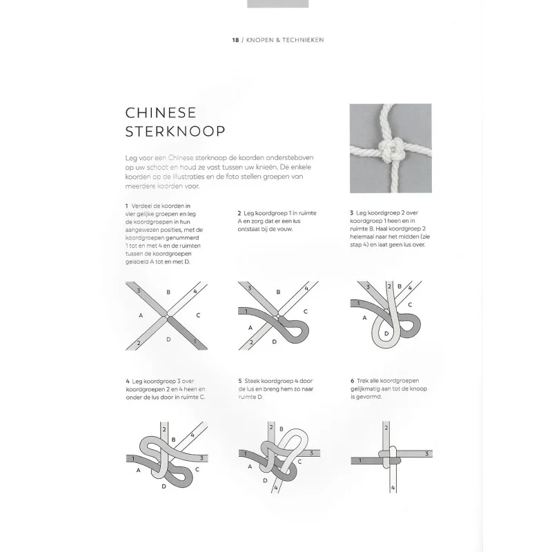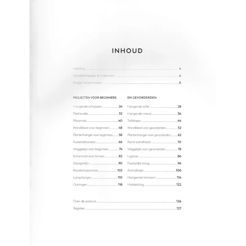 Het boek begint met een zeer duidelijke introductie van alle basisknopen, uitgelegd met heldere foto’s en stap-voor-stapinstructies. Hierdoor is het voor absolute beginners eenvoudig om meteen te starten, terwijl gevorderden een fijne opfrisser én nieuwe inzichten krijgen. De technieken worden rustig opgebouwd, zodat je al knoop voor knoop meer vertrouwen krijgt en klaar bent om grotere en complexere projecten aan te pakken.