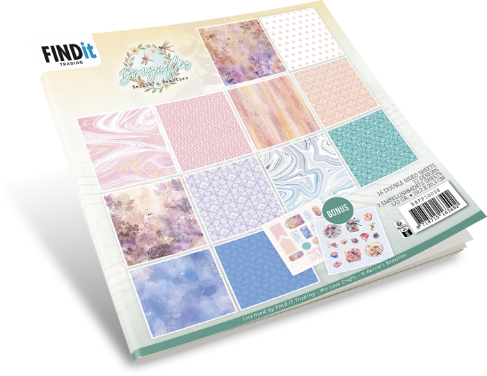 Het paperpack bevat 18 vellen dubbelzijdig designpapier met maar liefst 12 verschillende designs. Hierdoor heb je volop keuze om te combineren, lagen op te bouwen en unieke creaties te maken. De designs zijn geïnspireerd op de sierlijke schoonheid van libellen en natuurlijke elementen, waardoor elk vel een elegante en rustige sfeer uitstraalt. De zorgvuldig gekozen kleuren en patronen sluiten perfect op elkaar aan, zodat je eenvoudig verschillende motieven kunt mixen zonder dat het geheel onrustig wordt.