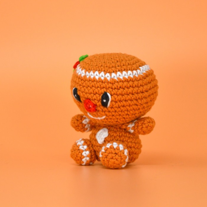 De haakkit bevat hoogwaardig 100% katoengaren in de klassieke gingerbread-kleur, aangevuld met contrasterende tinten voor de decoratieve details zoals ogen, knopen en vrolijke glazuurstrepen. Dankzij het stevige materiaal behoudt je gehaakte figuurtje zijn vorm, terwijl het toch een zachte, speelse uitstraling heeft die uitnodigt tot aanraken en bewonderen.