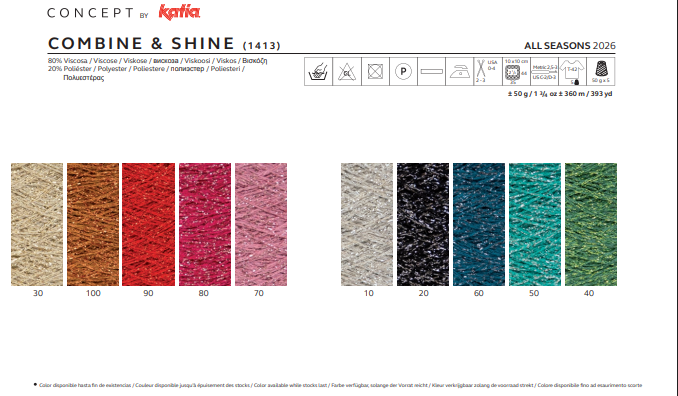 | Kleur | 10 Parelachtig licht grijs-Zilver, 100 Koper, 20 Zwart-Zilver, 30 Ivoor-Goud, 40 Groen, 50 Turquoise-Zilver, 60 Nacht blauw-Antraciet, 70 Kauwgom roze, 80 Fuchsia-Zilver, 90 Rood |